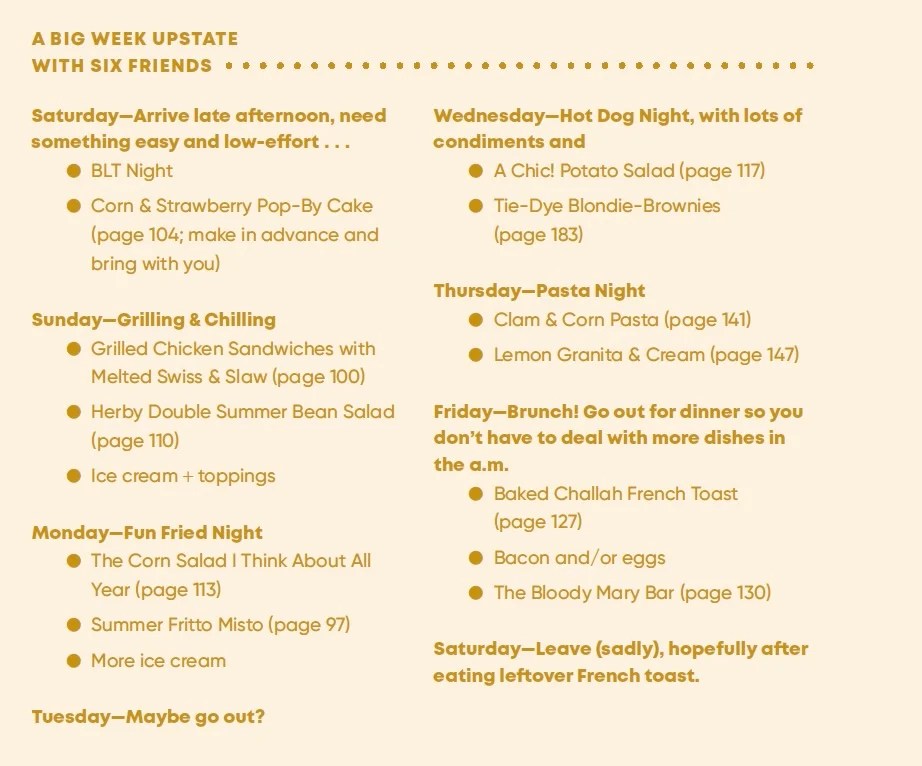 Mais c’est là que je me suis identifiée le plus à Lewin : avant de partir en vacances, conseille-t-elle, établissez un programme pour vos repas. Oui. Pour toute la semaine. Voici ce qu’elle pense :